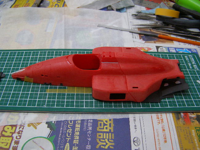 アンダ-トレイからボディ色となる部分を切り離してボディへ移植。ついでにノ-ズ部分のウイングフラップを差込み接着する穴も塞いでしまいます。