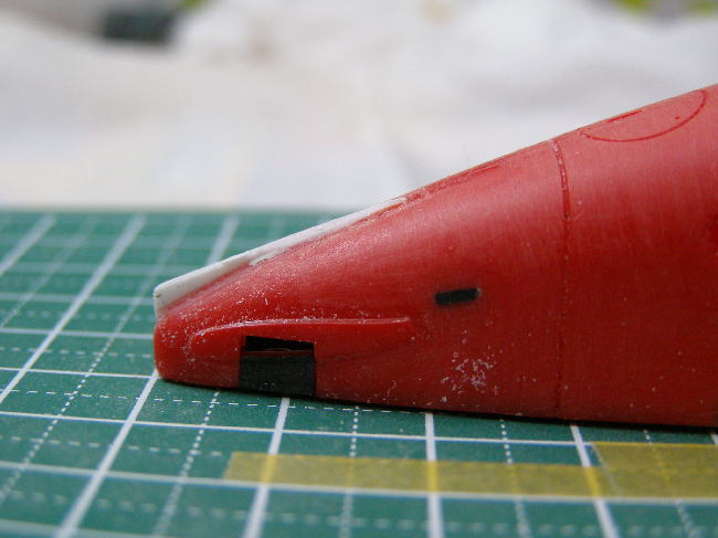 ノ-ズ先端と切り離したので、このままでは切り離した部分の固定がゆるくなるので、ちょっとしたベロをつけてノ-ズコ-ン側に差し込めるように簡単工作。