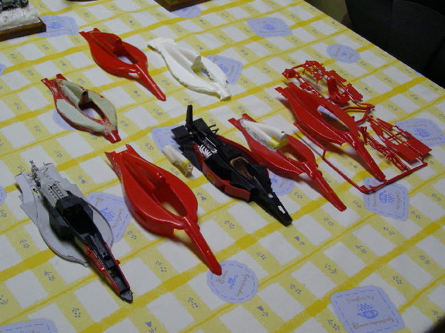 アンダ-トレイ、ミッション部分の形状だとか、モノコックのコクピット開口部の寸法修正だとか、バルクヘッドの追加だとか....。このキット、イタリアGP仕様ですが、僕はあのモナコGP仕様で製作を進めています。